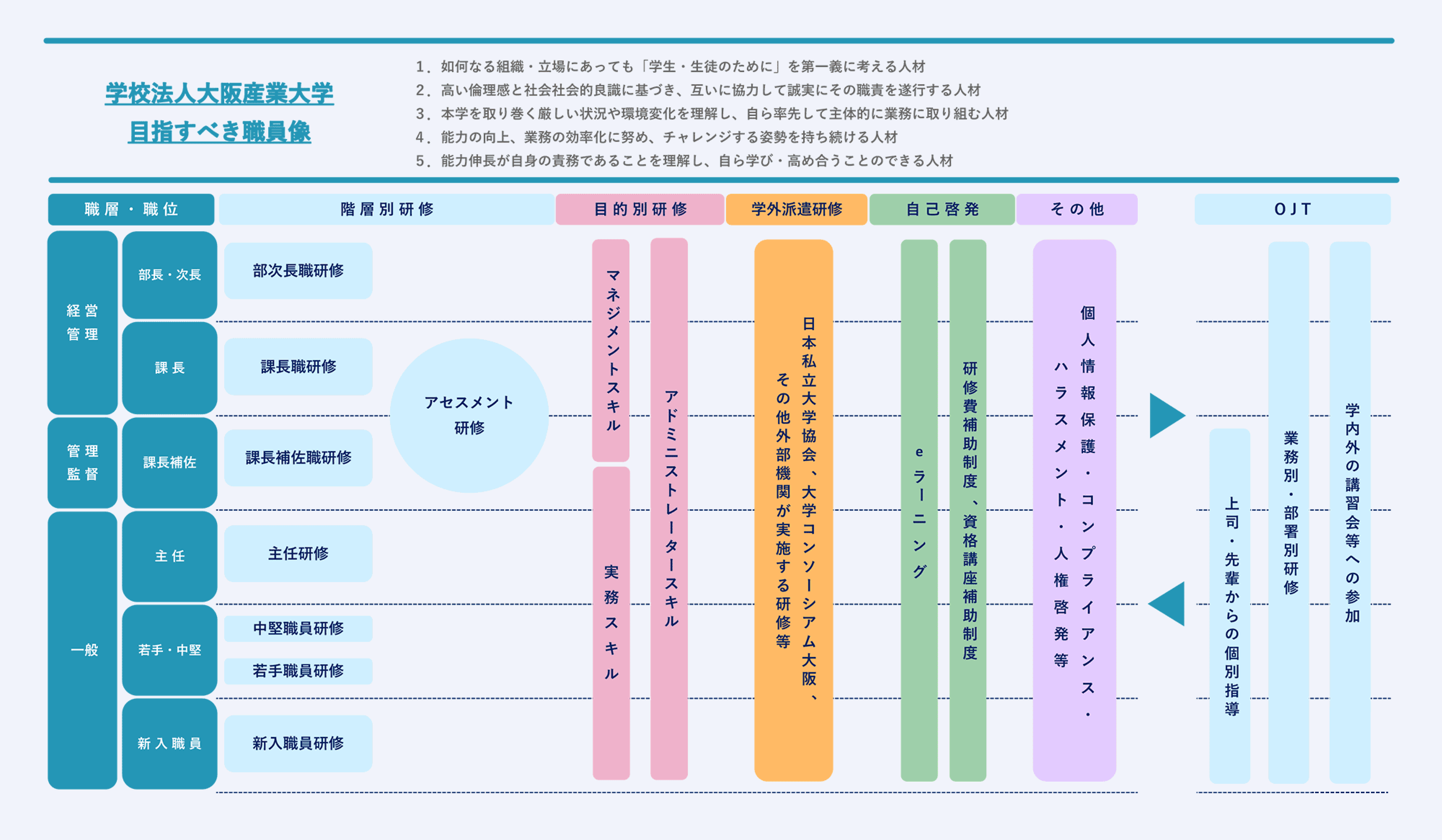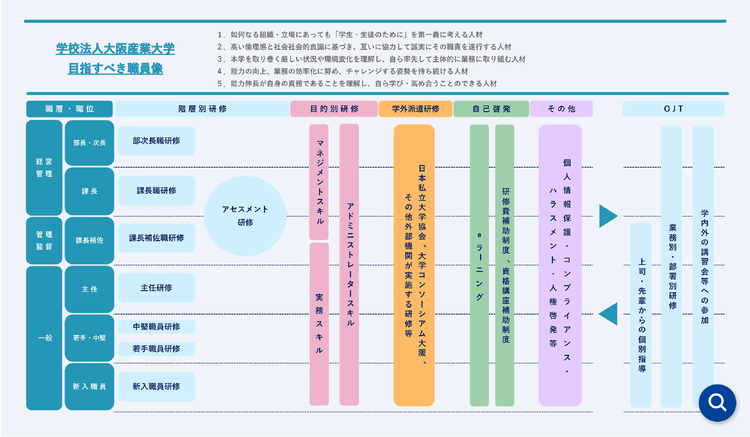 本学園はこの基本方針のもと、「OJT(職場内教育)」、「Off-JT(研修制度)」、「自己啓発」を3つの柱として育成体系を構築し、一人ひとりの自己実現を支援します。