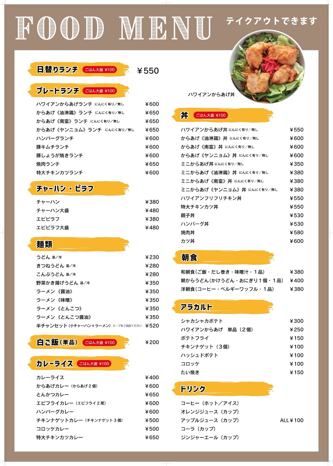 ハワイアンフリフリランチ630円、焼肉ランチ630円 etc.