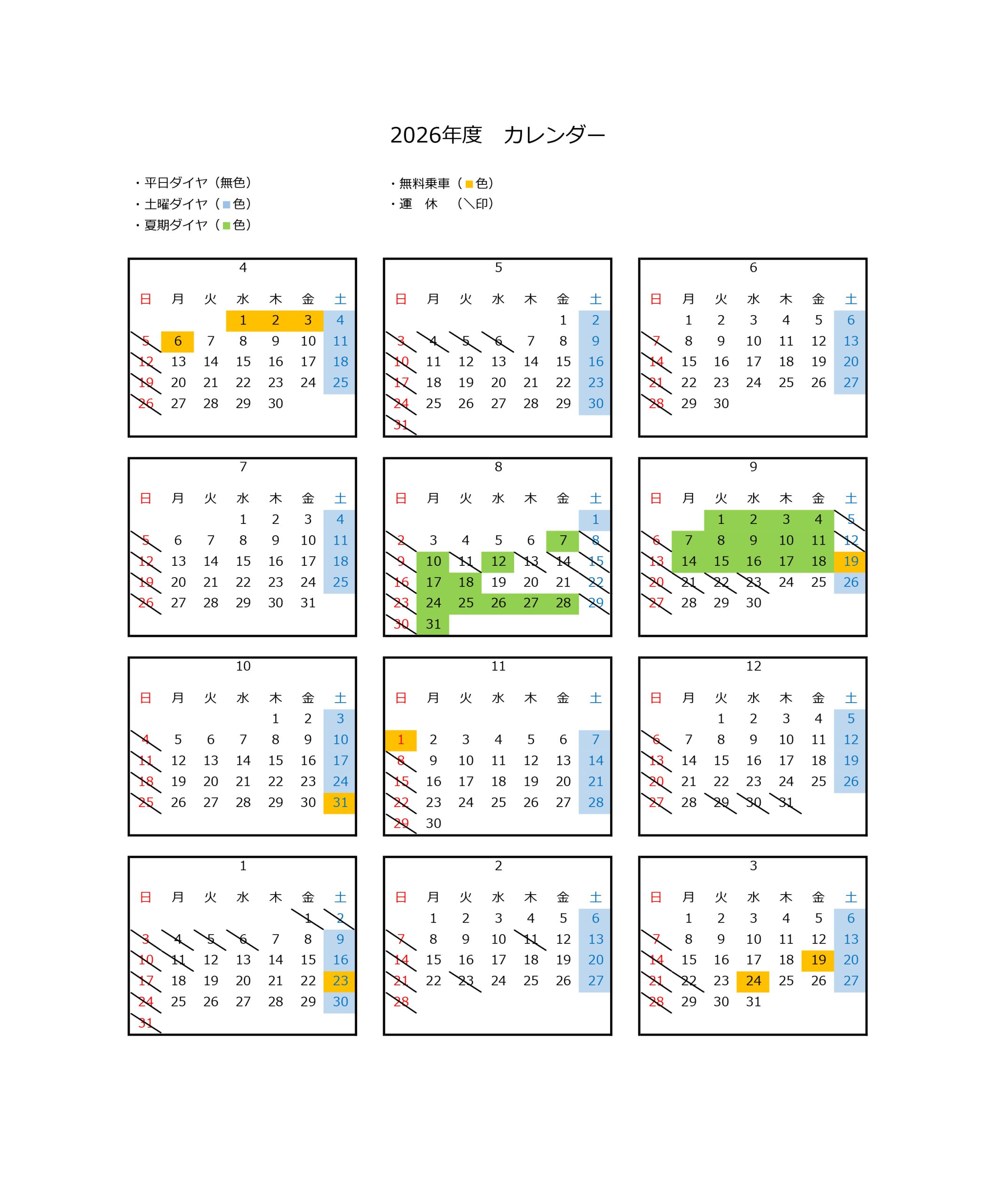 運行日程表および時刻表は、状況により変更される場合があります。今後の情報にご注意ください