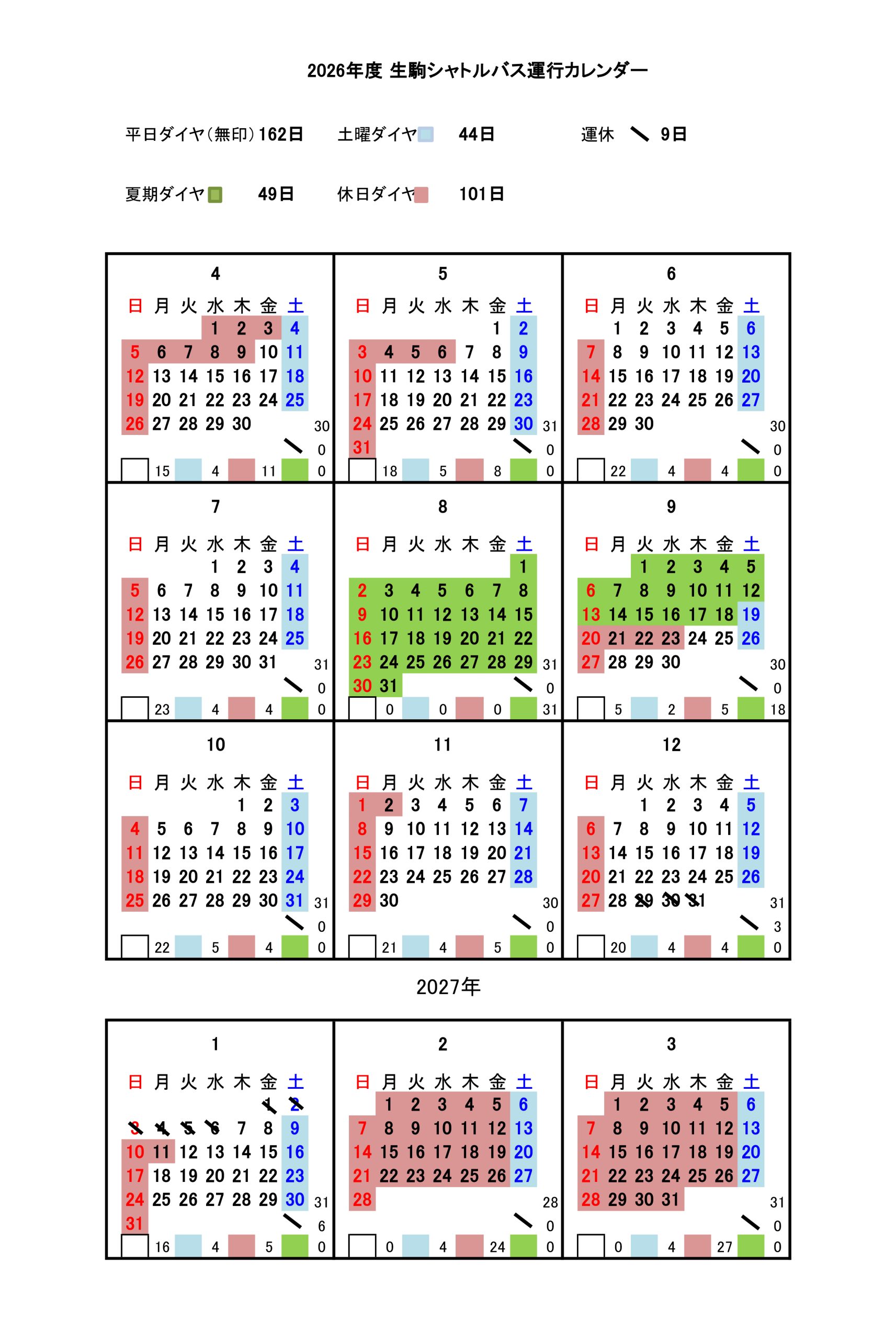 生駒シャトルバス 日程表(2026年度)