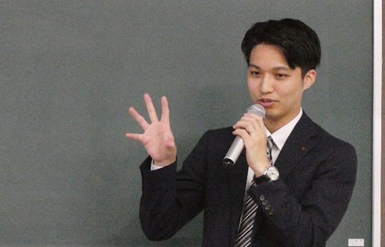 12月4日、経営学科2年生授業「キャリアデザインA」(担当教員:堀上)にて、鴻池運輸株式会社 人事・勤労部 係長 森田孝輔氏をお招きし、物流業界の構造、業務内容、職種等についてご講義いただきました。本科目では、複数の産業界の方にお越しいただいて、業界理解とキャリア形成のための視野を広げることを目的とした講義を実施しており、今回はその第四弾でした。森田氏からは、生産物流、販売物流などの物流の概要、物流に関わる様々なビジネス・業務内容・職種など、幅広くご説明いただきました。質疑応答では、専門職から総合職への職種変更に関する質問が出るなど、学生にとって物流業界における多様な業務についての理解を深める有意義な時間となりました。