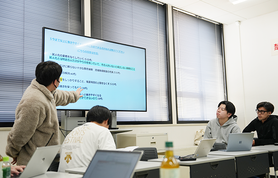富澤ゼミの専門演習1では、地域経済や中小企業について、産業やビジネスの観点から理解を深めることを目的に、地域の経済・産業や観光振興に関する資料を読むだけでなく、グループワーク、地元企業への取材や調査、それらの分析など、実践的に学ぶ機会が提供されています。また、学生にとっても地域経済や中小企業について学ぶことで、経済や社会を見る視点を身につけ、将来の進路やキャリア形成に繋がります。