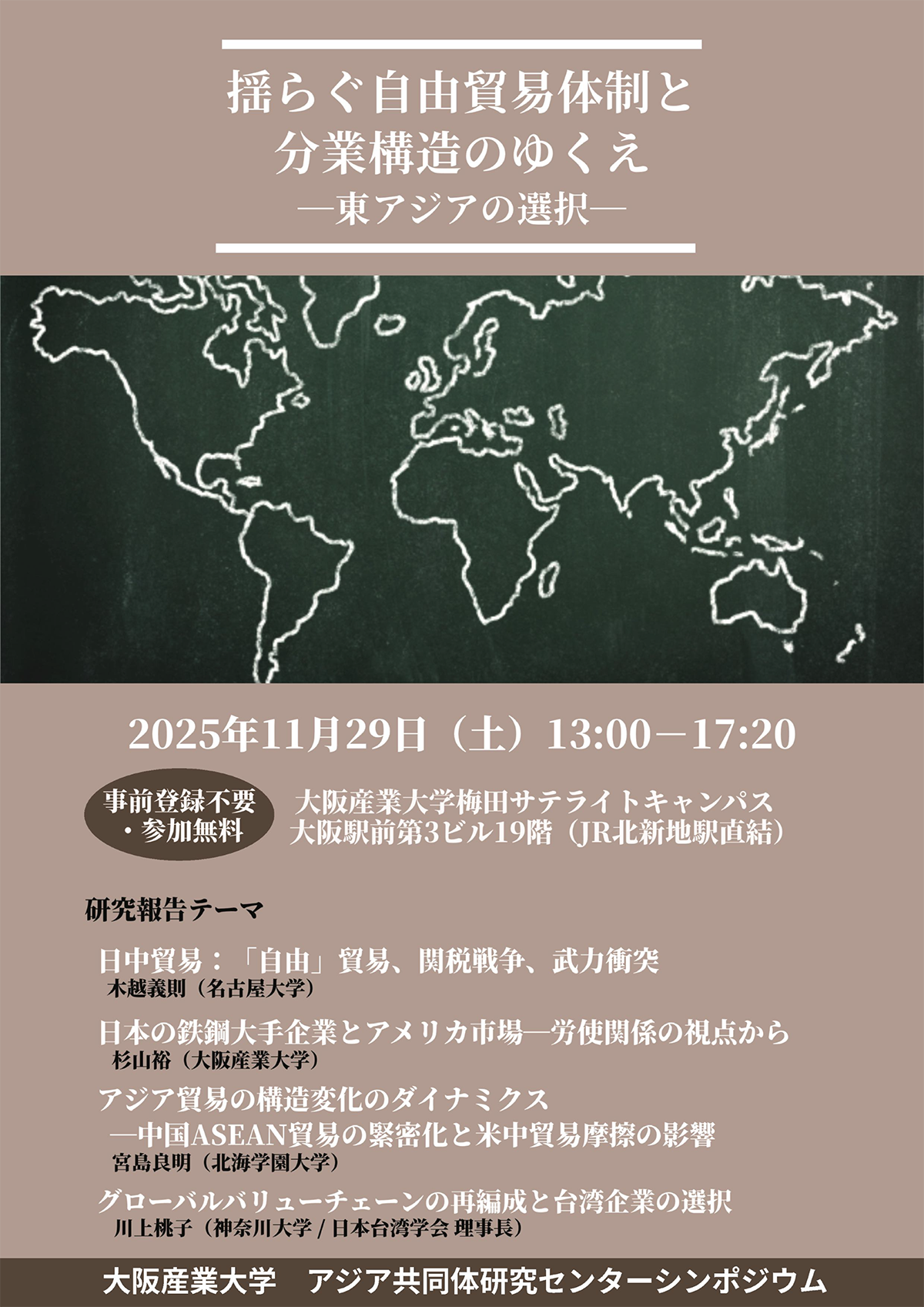大阪産業大学 アジア共同体センターでは、川上桃子氏(神奈川大学経済学部/日本台湾学会 理事長)をはじめ、多様な分野の専門家をお招きし、シンポジウムを開催します。国際情勢が大きく変化する中、自由貿易体制や東アジアの分業構造のゆくえについて、多角的な視点から議論します。事前登録は不要です。どなたでもご参加いただけますので、ぜひお越しください。