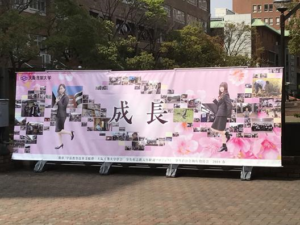 学内では,歓迎の意を表する巨大看板が設けられ,新入生の入学を祝う催しやなどもあり,キャンパス内は歓迎のムードにあふれていました.