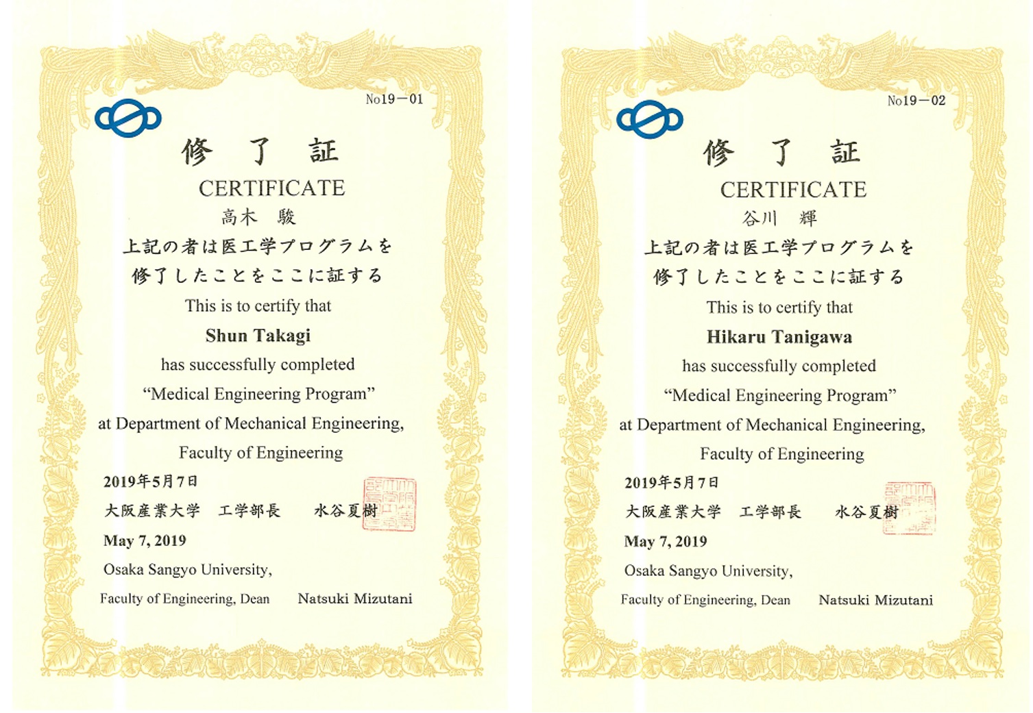 本機械工学科では、医学・医療に関連する授業を用意しております。 そういった科目も含めて幅広く工学の勉強をした学生に医工学プログラムの授与を行っています。 今回2名の修了者がおりました!