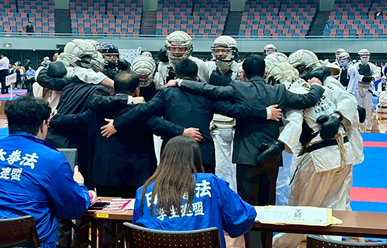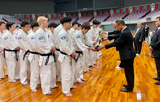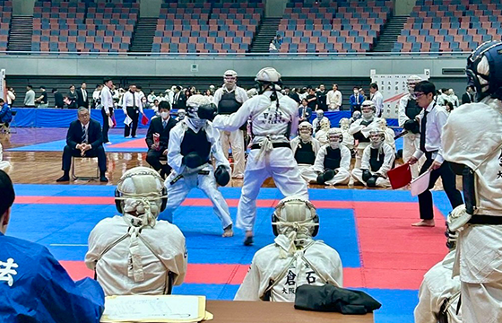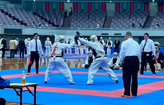 序盤は劣勢の展開となりましたが、中堅の鈴木竣汰朗さん(スポーツ健康学部・3回生)と大将の田村虎太郎さん(経済学部・2回生)が勝負強い拳法で流れを引き戻し、勝敗の行方は大将戦へ。延長戦に及ぶ大接戦の末、惜しくも敗退となりましたが、王者をあと一歩まで追い詰める白熱の展開となりました。