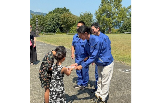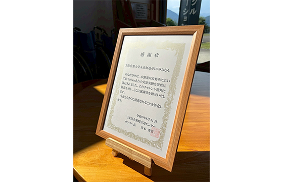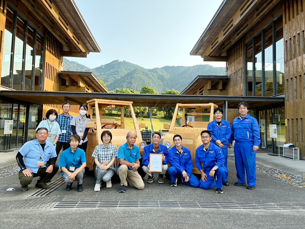 道中で多くのトラブルが発生しましたが、「最後まで電気自動車で走り切りたい!」という学生たちの強い思いで困難を乗り越え、無事に「熊野古道センター」に到着することができました。現地ではセンター長の宮本様をはじめ、職員の方々、そして地元の皆さんの温かい笑顔が待っていました。到着を祝うかのように、地元の小さな子どもたちからは手作りの感謝状が贈呈されました。
