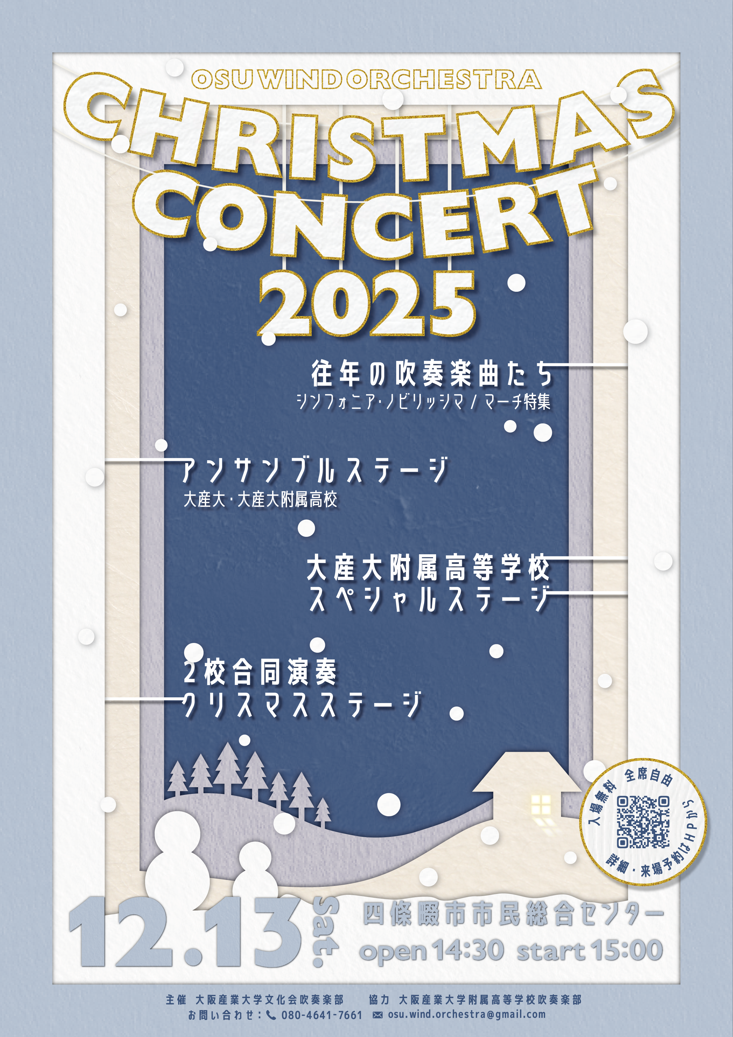 また、吹奏楽部は、12月13日(土)にも四條畷市市民総合センターにおいてクリスマスコンサートを予定しております。